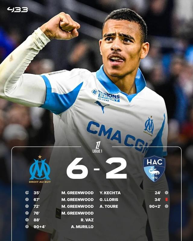 原本只是一場(chǎng)普通聯(lián)賽,卻被寫進(jìn)歷史。馬賽在主場(chǎng)6-2橫掃勒阿弗爾,24歲的英格蘭前鋒梅森·格林伍德獨(dú)中四元,成為馬賽主場(chǎng)唯一的焦點(diǎn)。格林伍德在主場(chǎng)全面展示了自己的進(jìn)攻武器庫:點(diǎn)球、一腳觸球破門、遠(yuǎn)射以及一次閃電般的配合進(jìn)球,幫助馬賽6-2橫掃勒阿弗爾。